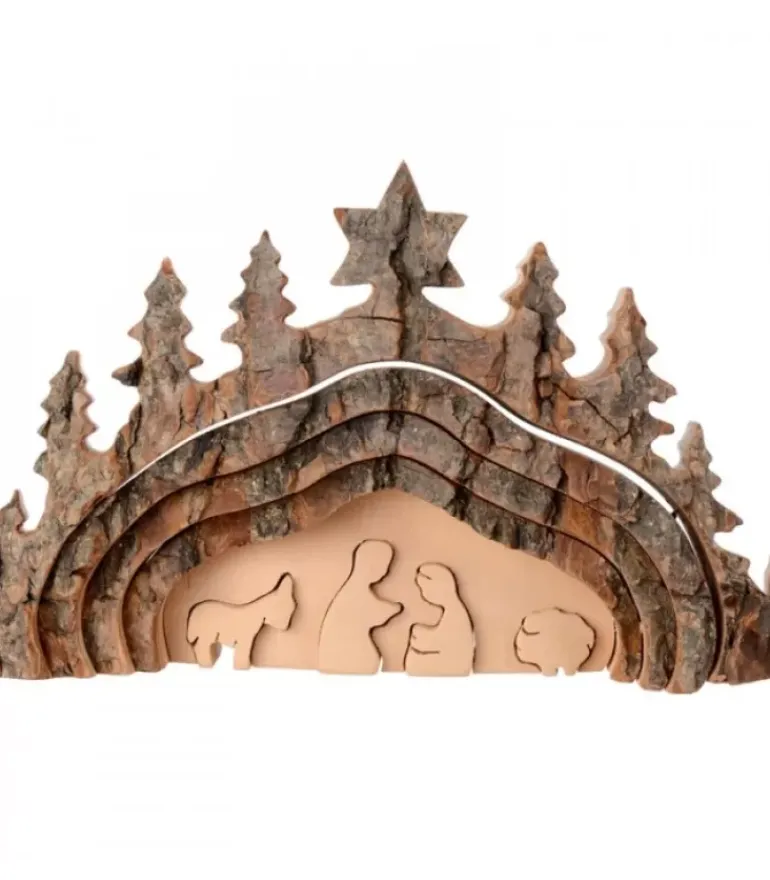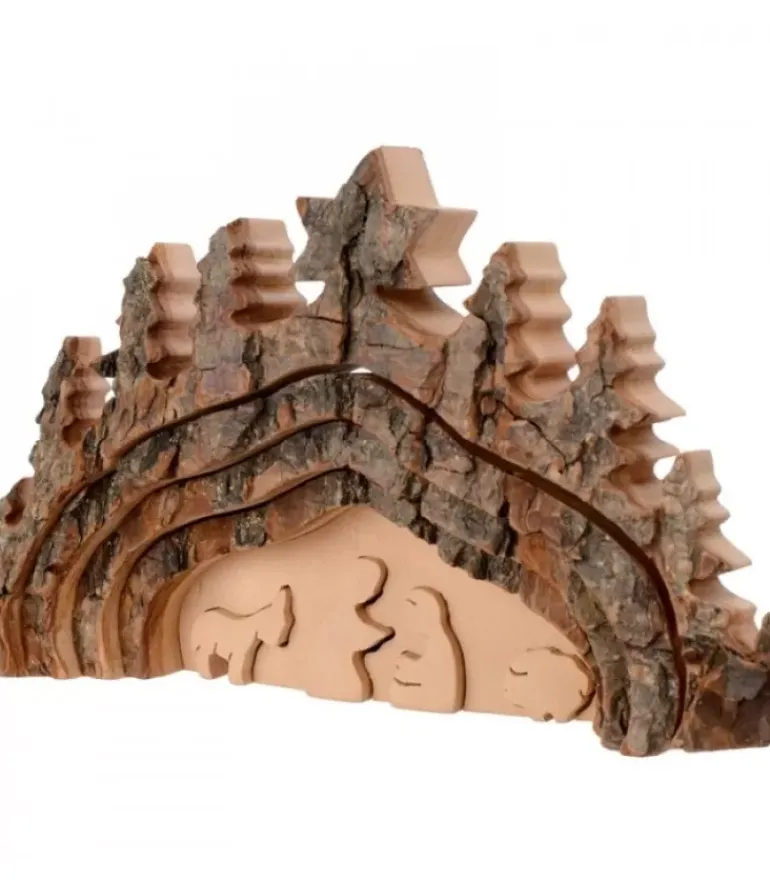 Crèche De Noël En Bois Taillee Dans De L’Ecorce.