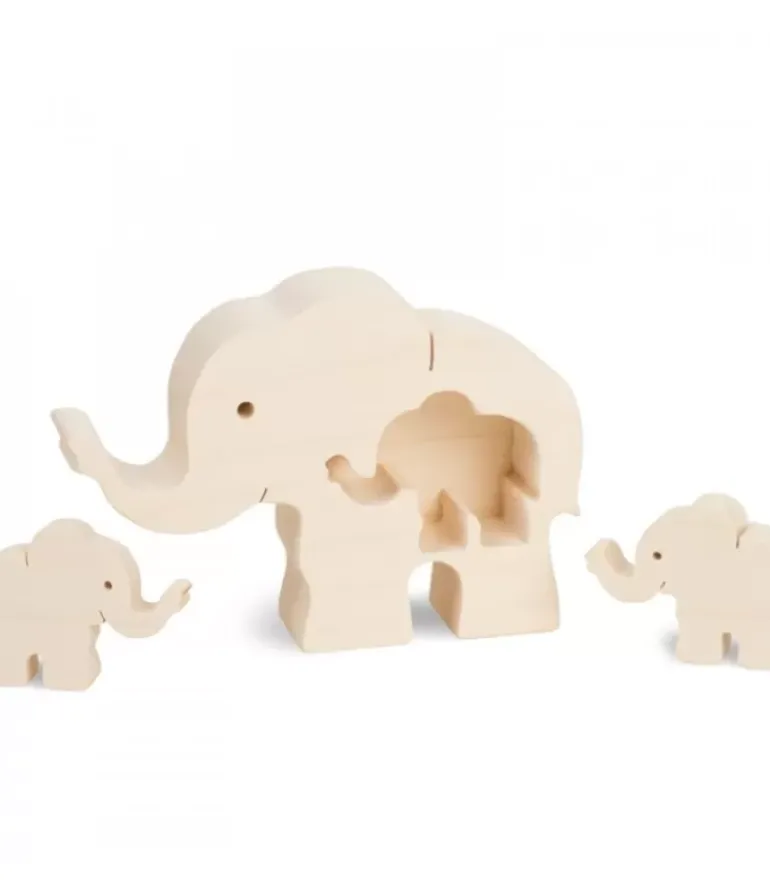 Elephant En Bois Avec Deux Bebes Elephants, 8,5 Cm