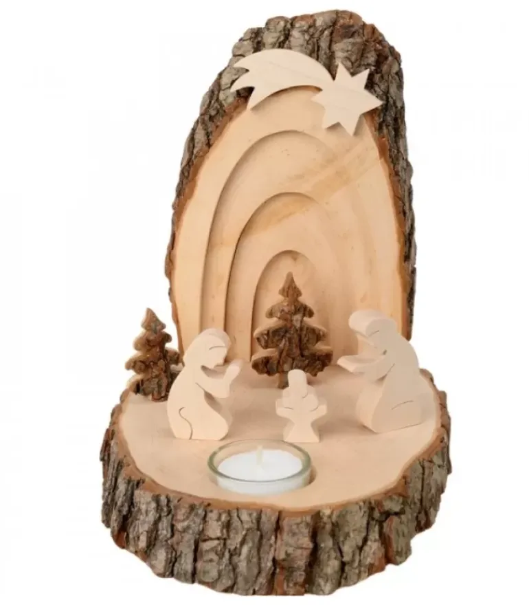 Figurines Enfant Jesus, Joseph Et Marie En Bois Cisele, Etoile Filante Sur Le Dessus Et 2 Sapins Sur Le Devant. Avec Bougeoir Dans Un Photophore Transparent.