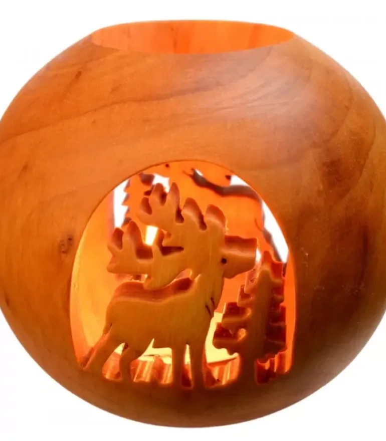 Photophore En Bois Naturel De Forme Ronde Avec Un Cerf Découpe Et Une Etoile Sur Les 2 Autres Faces.