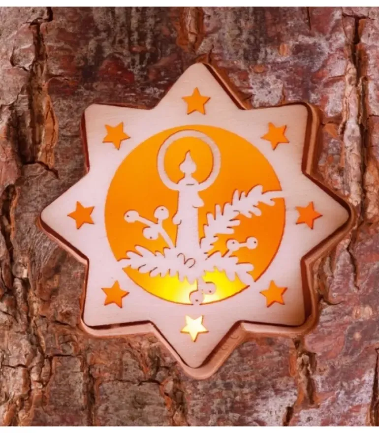 Photophore Dans Un Rondin De Bois Avec Deux Motifs Translucides : Bougie Sur Une Branche Et Nativite Avec Enfant Jesus, Marie Et Joseph.