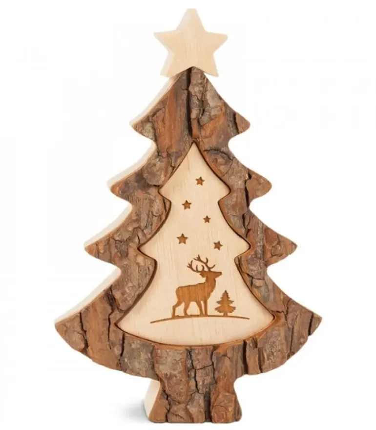 Sapin De Noël En Bois Découpe Dans De L’Ecorce Avec Etoile Sur Le Dessus.