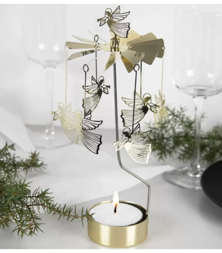 Grand Bougeoir Carrousel Avec Anges De Noël Volants En Metal Dore.