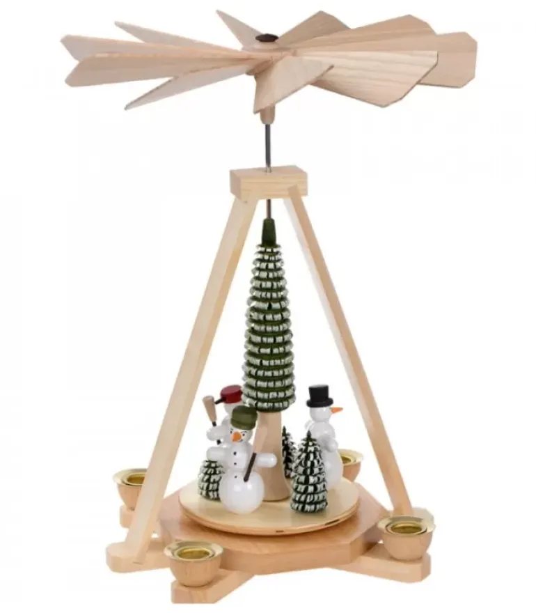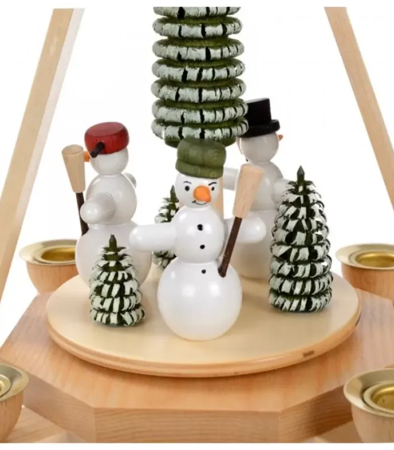 Pyramide A Bougie Avec Bonhommes De Neige Autour D’Un Sapin.