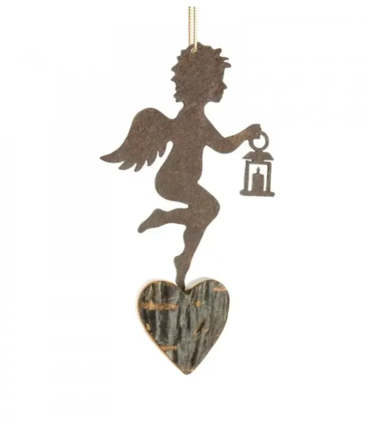 Petit Ange A Suspendre Pour Sapin De Noël Debout Sur Un Coeur En Bois Et Tenant Une Lanterne.