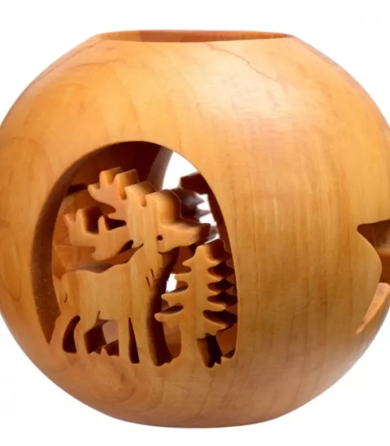 Photophore En Bois Naturel De Forme Ronde Avec Un Cerf Découpe Et Une Etoile Sur Les 2 Autres Faces.
