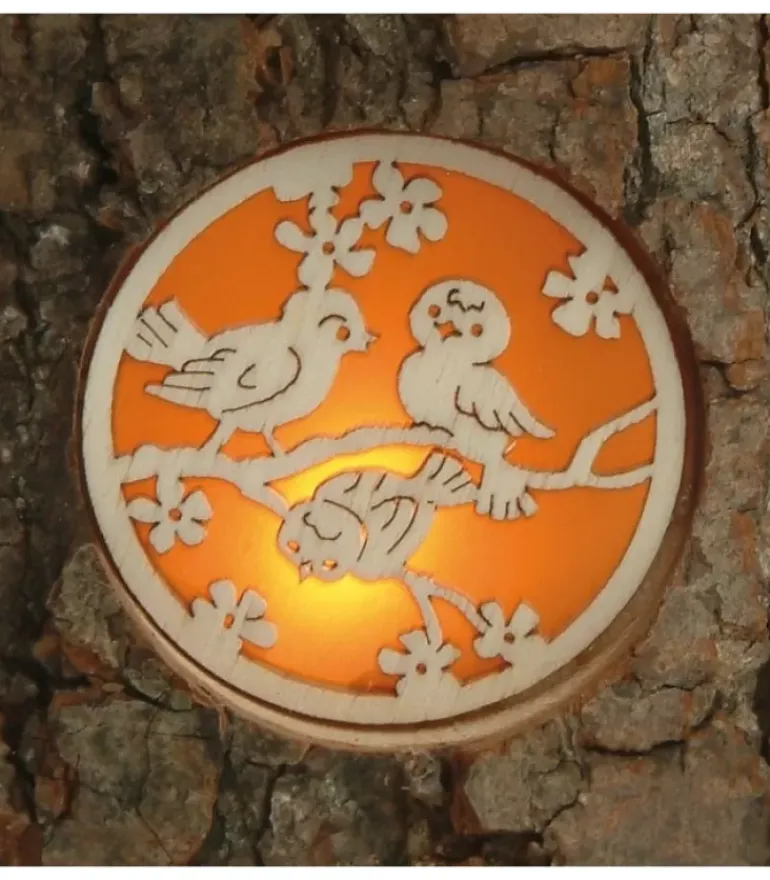 Photophore Dans Un Rondin De Bois Avec Trois Motifs Translucides : Oiseaux Sur Une Branche, Hiboux Dans Un Arbre Et Animaux Dans La Foret.