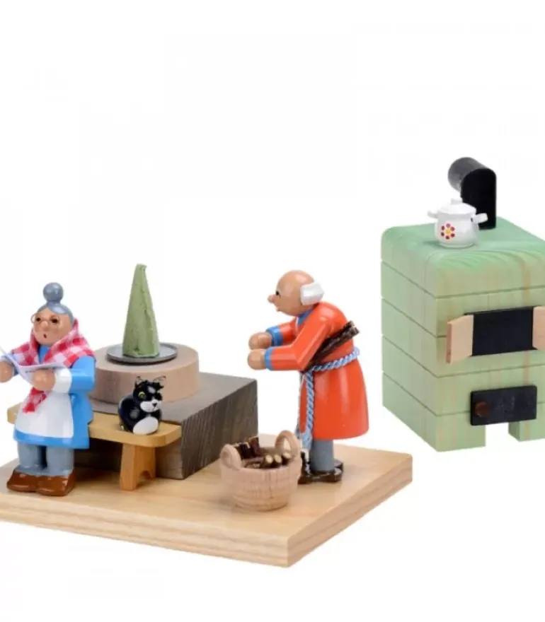 Poele En Faience Avec Grand-Mere Lisant Le Journal Et Grand-Père Qui Allume Le Feu.