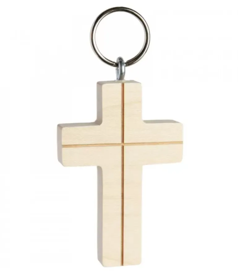 Porte-Cle Croix En Bois Avec Croix Fine Gravee, 5 Cm
