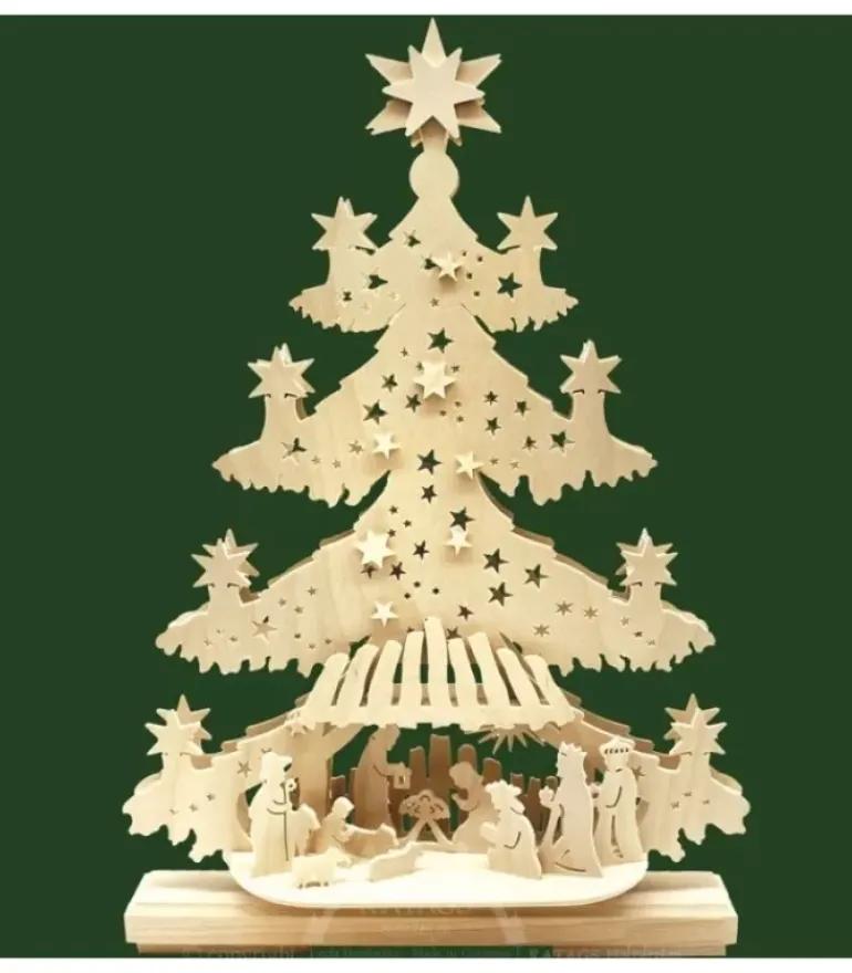 Crèche En Bois Avec Personnages Dans Un Petit Sapin De Noël Lumineux 220 V.